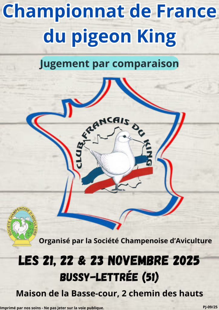 22 et 23 Novembre Bussy-Lettrée (51). Championnat de France du King organisée par la Société Champenoise d’Aviculture. Prévostat Jean-Marie tél 06 21 84 63 32